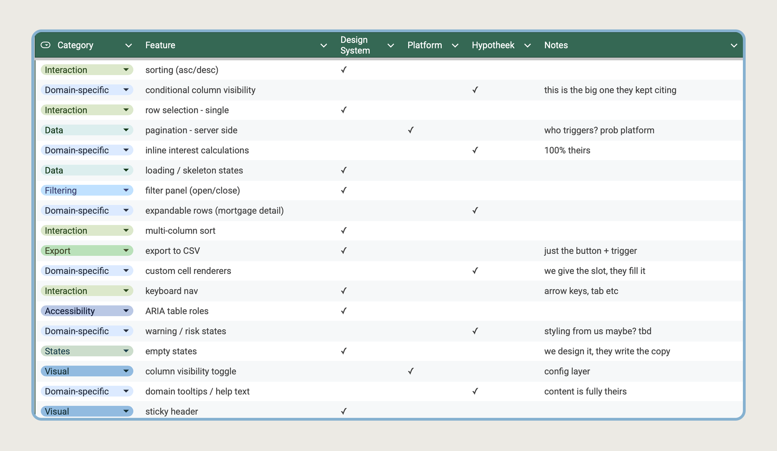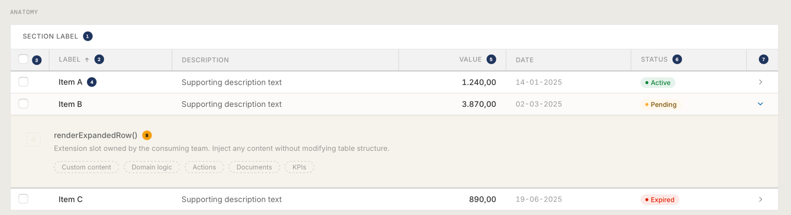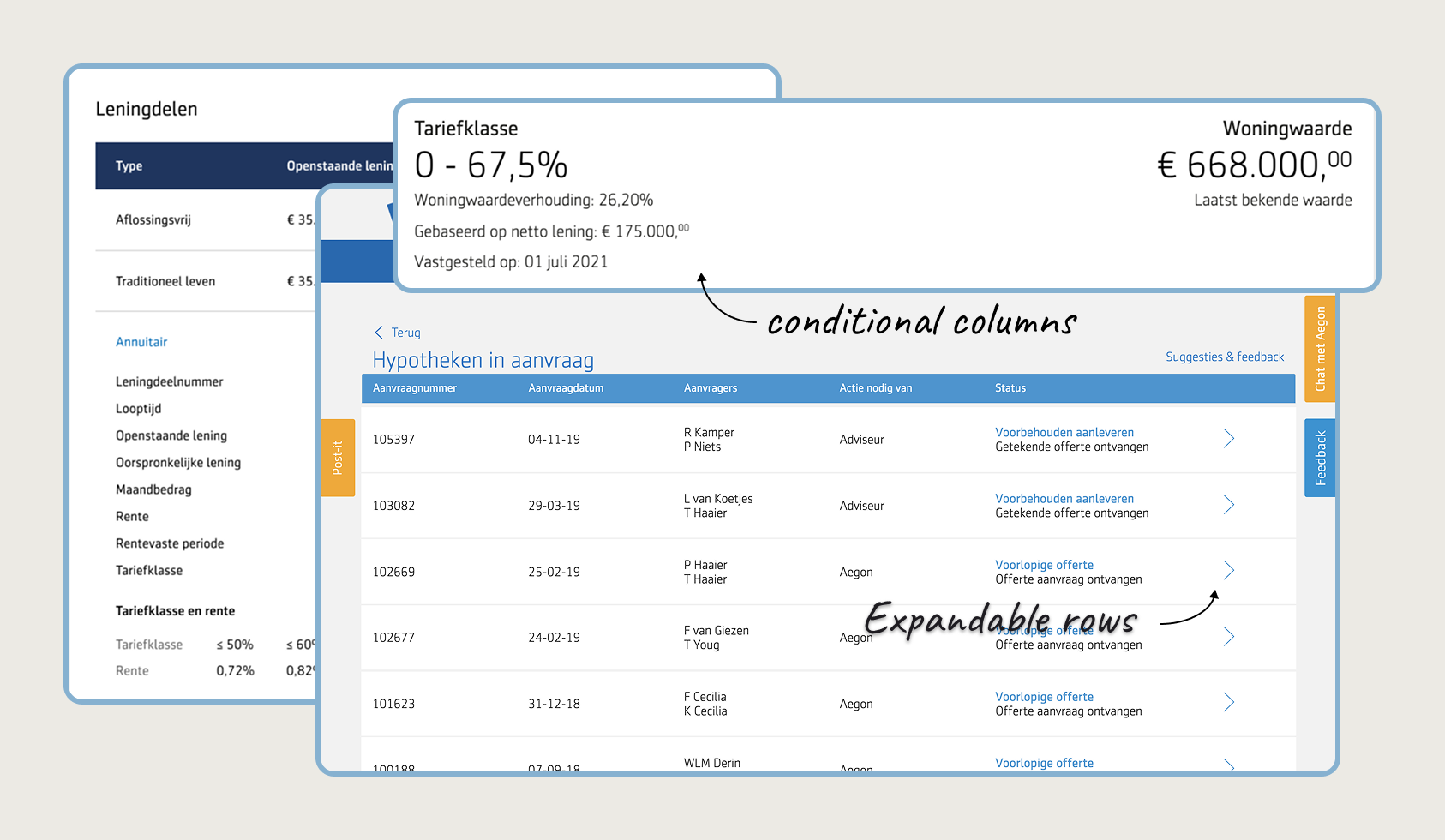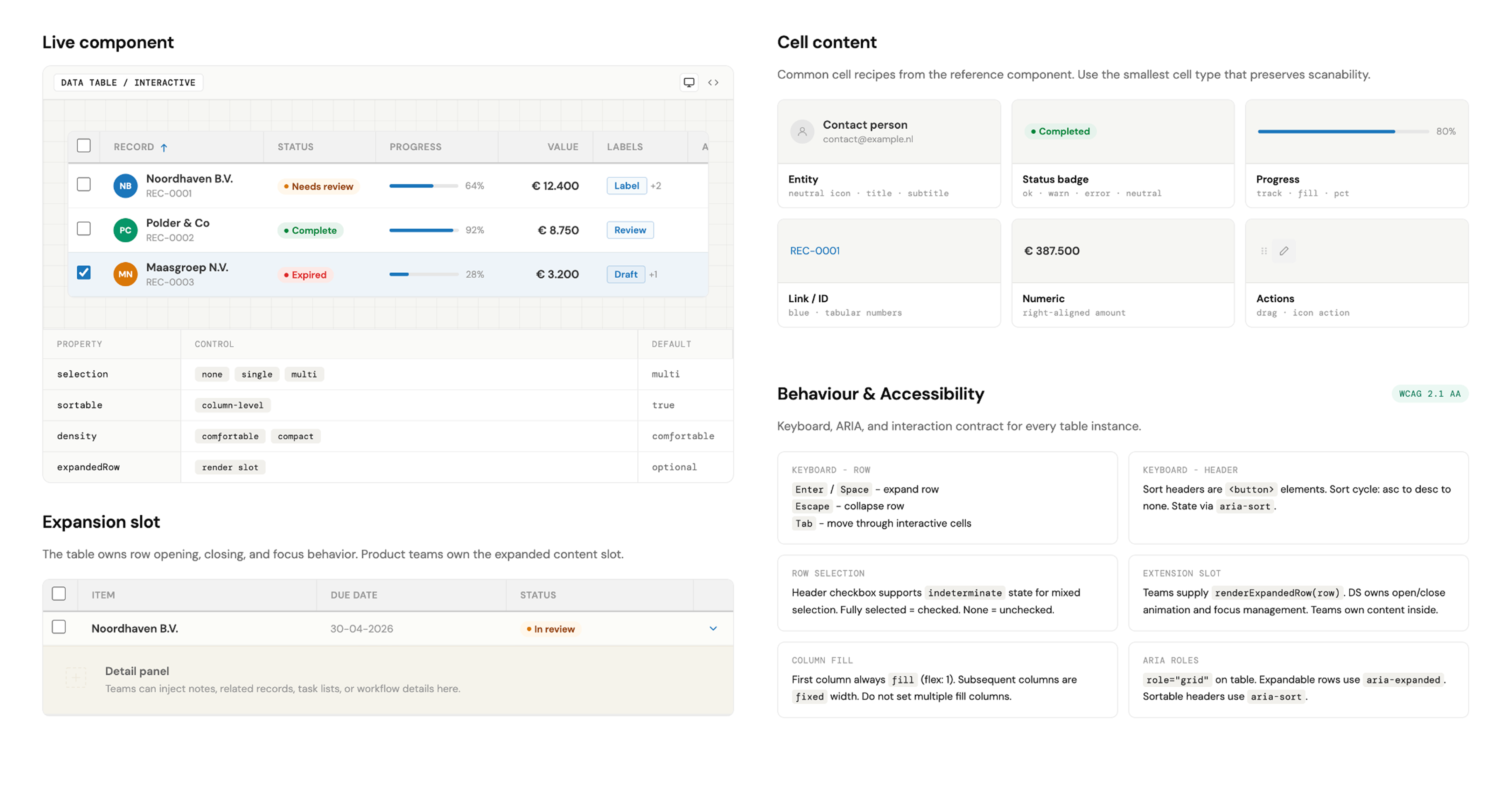 We evolved the Data Table into a composable core with explicit extension points. Structure, behaviour, and accessibility shared; cell rendering, expansion slots, and conditional columns owned by Hypotheek.